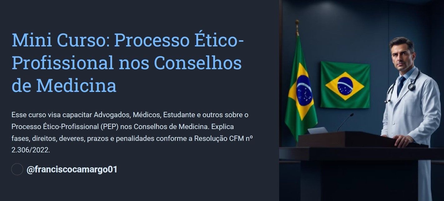 Com o Mini Curso de Processo Ético-Profissional nos Conselhos de Medicina, aprenda de forma clara e prática como funcionam as sindicâncias e os processos ético-profissionais nos Conselhos de Medicina. Ministrado por Francisco Camargo, obtenha um conteúdo técnico, didático e diretamente aplicável à prática profissional. Adquira o curso agora e aprimore seus conhecimentos para uma atuação ética e profissional nos Conselhos de Medicina.